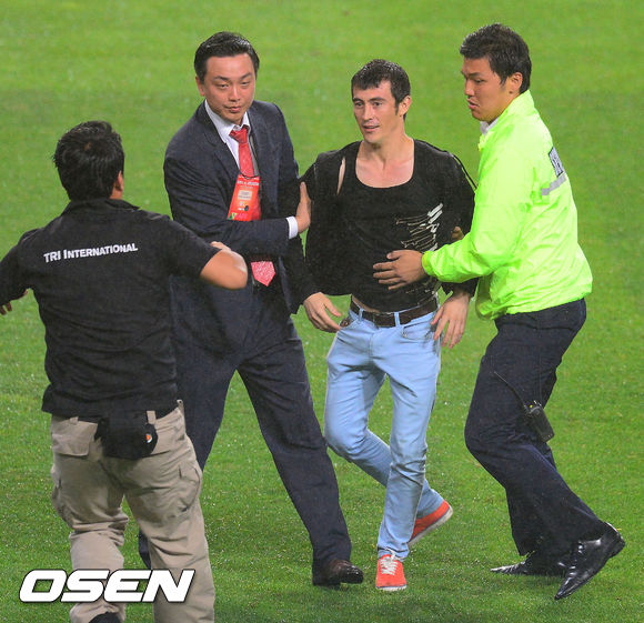 11일 오후 서울월드컵경기장에서 열린 '2014 브라질월드컵 아시아 최종예선 A조 7차전' 한국과 우즈베키스탄의 경기, 후반 한 우즈벡 관중이 난입해 경호원에게 제지당하고 있다