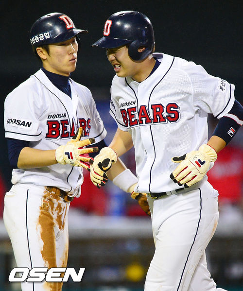 11일 오후 서울 잠실구장에서 열린 2013 한국야쿠르트 세븐프로야구 두산 베어스와 SK 와이번스의 경기, 8회말 2사 주자 만루 민병헌의 좌익수 앞 2타점 적시타때 홈을 밟은 허경민과 박건우가 하이파이브를 하고 있다.