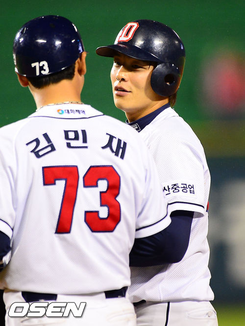 11일 오후 서울 잠실구장에서 열린 2013 한국야쿠르트 세븐프로야구 두산 베어스와 SK 와이번스의 경기, 8회말 2사 주자 만루 민병헌이 좌익수 앞 2타점 적시타를 날린 후 1루에서 김민재 코치와 하이파이브를 하고 있다.