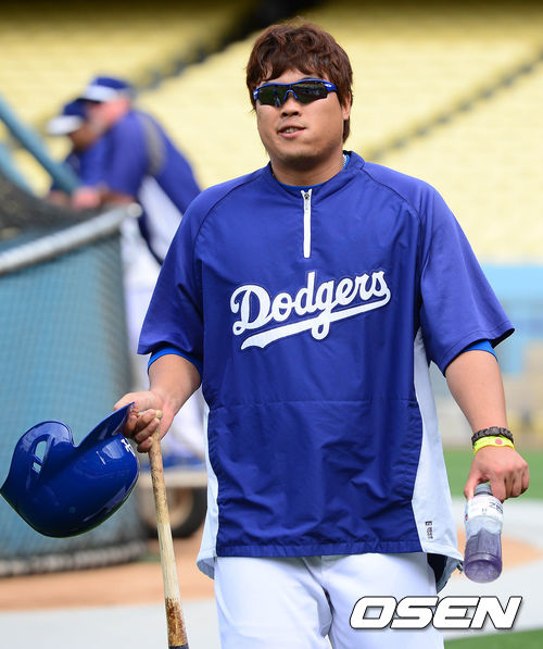 12일 오전(이하 한국시간) 미국 캘리포니아주 로스앤젤레스 다저스타디움에서 열리는 LA 다저스와 애리조나 다이아몬드백스의 경기 시작 전 류현진이 배팅훈련을 마치고 덕아웃으로 향하고 있다.