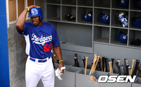 12일 오전(이하 한국시간) 미국 캘리포니아주 로스앤젤레스 다저스타디움에서 열리는 LA 다저스와 애리조나 다이아몬드백스의 경기 시작 전 푸이그가 배팅훈련 준비를 하고 있다.