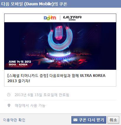 이와 함께 다음은 ‘다음 모바일 공식 페이스북’에서 쿠폰 이벤트를 진행한다. 쿠폰을 다운로드 받은 후 ‘울트라 코리아’ 현장에 위치한 다음 부스에 제시하면 일 선착순 2500명(총 5000명)에게 스페셜 티머니카드(판매가 3000원)를 증정한다. ‘울트라 코리아’ 현장 내의 모든 가맹점에서는 티머니로만 결제가 가능하기 때문에 음료, 간식 등을 구매하기 위해서는 티머니카드가 필수다.