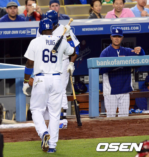 12일 오전(이하 한국시간) 미국 캘리포니아주 로스앤젤레스 다저스타디움에서 열린 LA 다저스와 애리조나 다이아몬드백스의 경기 4회말 1사 1루 푸이그가 삼진을 당한 후 덕아웃으로 향하고 있다.