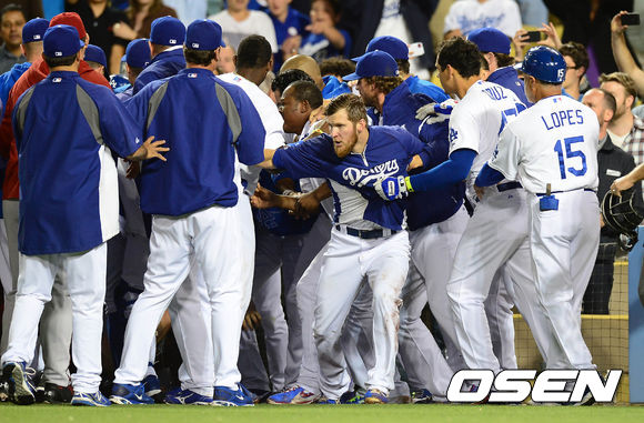 12일 오전(이하 한국시간) 미국 캘리포니아주 로스앤젤레스 다저스타디움에서 열린 LA 다저스와 애리조나 다이아몬드백스의 경기 7회말 1사 그레인키가 케네디의 보복 사구에 몸을 맞자 경기 두 번째 벤치클리어링이 일어나고 있다.