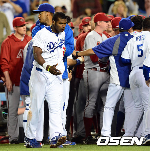 [OSEN=이슈팀] LA다저스 '쿠바 특급' 야시엘 푸이그(23)가 92마일 강속구를 안면에 맞고도 교체되지 않는 투혼을 발휘하며 1루로 걸어나갔다. 그러나 이후에도 몸에 맞는 볼이 나오며 다저스 벤치클리어링으로 이어졌다.