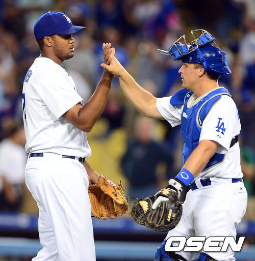 12일 오전(이하 한국시간) 미국 캘리포니아주 로스앤젤레스 다저스타디움에서 열린 LA 다저스와 애리조나 다이아몬드백스의 경기 종료 후 잰슨과 페데로위츠가 하이파이브를 하고 있다.