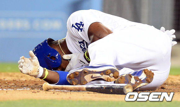 12일 오전(이하 한국시간) 미국 캘리포니아주 로스앤젤레스 다저스타디움에서 열린 LA 다저스와 애리조나 다이아몬드백스의 경기 6회말 1사 푸이그가 케네디의 투구에 안면을 맞고 쓰러져 있다.