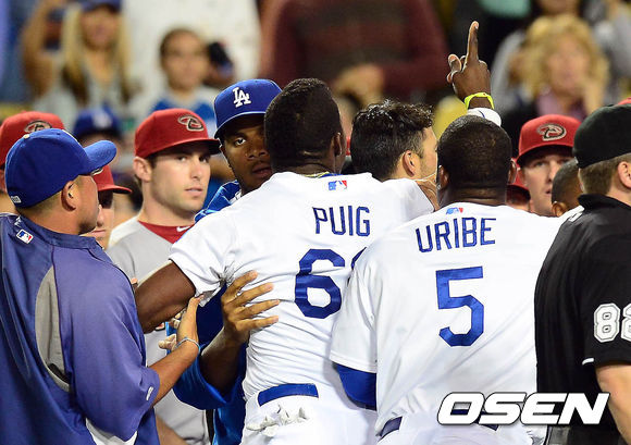 7회말 그레인키의 사구때 푸이그가 애리조나 선수들과 몸싸움을 벌이고 있다. /baik@osen.co.kr