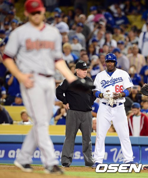 6회말 1사 푸이그가 케네디의 투구에 안면을 맞고 진루한 후 케네디를 노려보고 있다. /baik@osen.co.kr