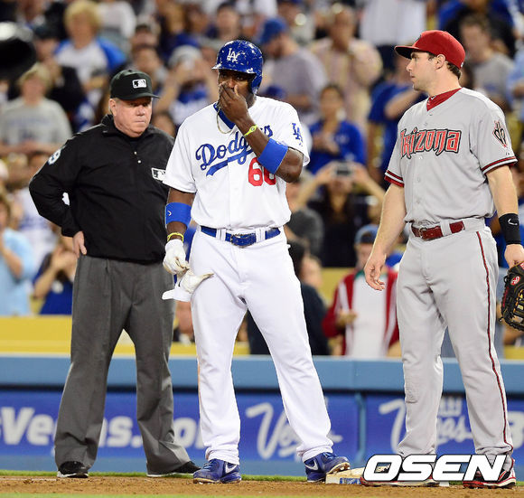 6회말 1사 푸이그가 케네디의 투구에 안면을 맞고 진루 코를 만지고 있다. /baik@osen.co.kr