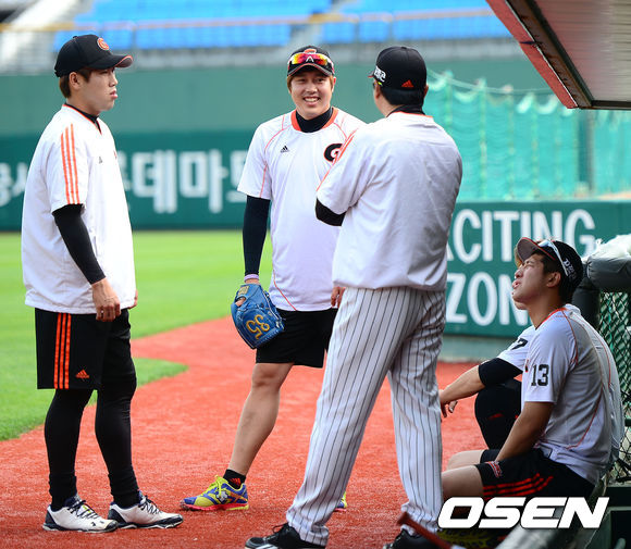 12일 오후 부산 사직구장에서 열리는 '2013 한국야쿠르트 세븐 프로야구' 롯데 자이언츠와 넥센 히어로즈의 경기에 앞서 롯데 정민태 코치가 선수들과 이야기를 나누고 있다.