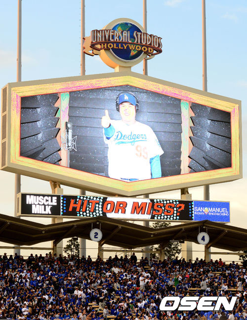 12일 오전(이하 한국시간) 미국 캘리포니아주 로스앤젤레스 다저스타디움에서 열린 LA 다저스와 애리조나 다이아몬드백스의 경기, 류현진이 전광판 이벤트에 출연하고 있다.