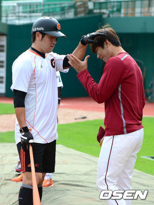 12일 오후 부산 사직구장에서 열리는 '2013 한국야쿠르트 세븐 프로야구' 롯데 자이언츠와 넥센 히어로즈의 경기에 앞서 롯데 강민호와 넥센 강정호가 이야기를 나누며 장난을 치고 있다.