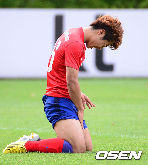 대표팀 이광훈이 문전에서 넘어지며 괴로워하고 있다.