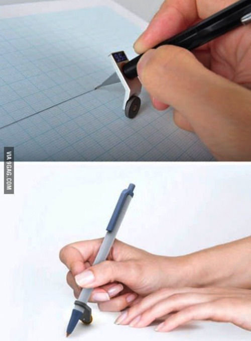 공개된 '자 없이 직선 긋기' 사진에는 자를 사용하지 않고도 직선을 그을 수 있는 제품의 모습이 나온다. 지지대 역할을 하는 원형 모양의 롤러를 볼펜에 끼워 반듯한 직선을 그릴 수 있는 것이다.