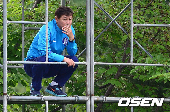 이광종 감독이 철골 구조물에 올라 진지한 표정으로 경기를 지켜보고 있다.