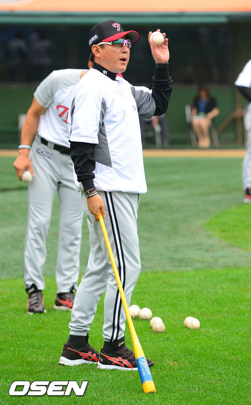 12일 오후 대전구장에서 열린 2013 한국야쿠르트 세븐 프로야구 한화 이글스와 LG 트윈스의 경기, 경기에 앞서 LG 김기태 감독이 외야수비를 위한 펑고를 치고 있다