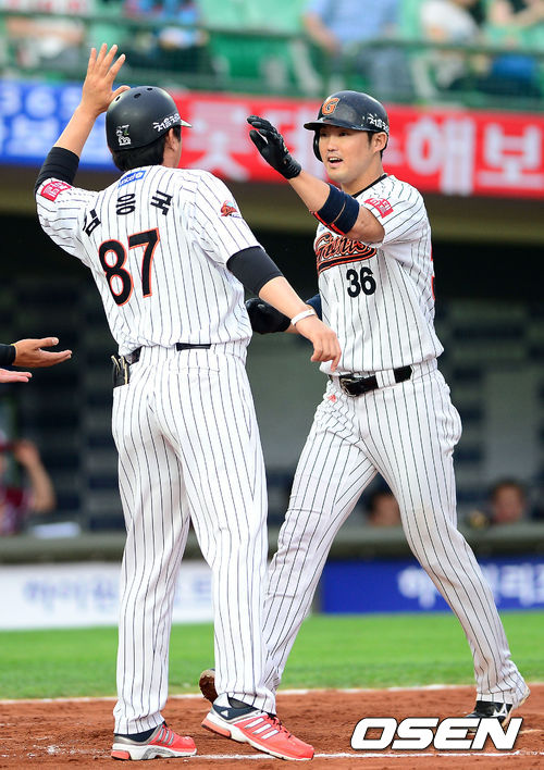 12일 오후 부산 사직구장에서 열린 '2013 한국야쿠르트 세븐 프로야구' 롯데 자이언츠와 넥센 히어로즈의 경기, 1회말 2사 1,2루 롯데 박종윤이 우측 담장을 넘기는 3점 홈런을 때린 뒤 1루 김응국 코치와 하이파이브를 하고 있다.