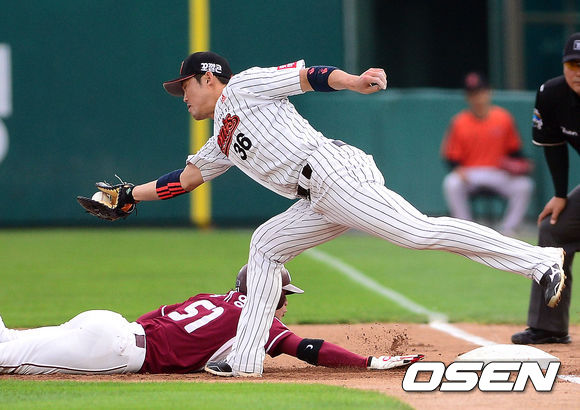 12일 오후 부산 사직구장에서 열린 '2013 한국야쿠르트 세븐 프로야구' 롯데 자이언츠와 넥센 히어로즈의 경기, 1회초 1사 1루 롯데 박종윤이 투수 송승준이 던진 견제구를 잡아내고 있다.