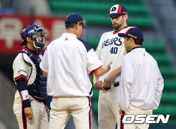 12일 오후 서울 잠실야구장에서 '2013 한국야쿠르트 세븐 프로야구' 두산 베어스와 SK 와이번스의 경기가 열렸다. 4회초 SK 공격 무사 1, 2루 상황 두산 정명원 코치가 마운드에 올라 선발 니퍼트와 대화를 나누고 있다.