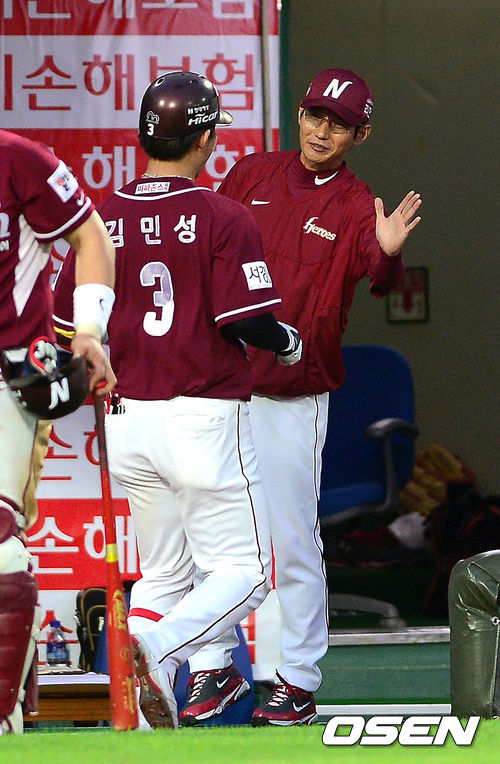 12일 오후 부산 사직구장에서 열린 '2013 한국야쿠르트 세븐 프로야구' 롯데 자이언츠와 넥센 히어로즈의 경기, 4회초 2사 1루 넥센 김민성이 2점 홈런을 때린 뒤 염경엽 감독과 하이파이브를 하고 있다.
