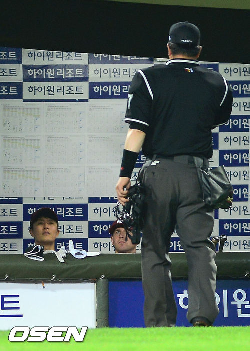 12일 오후 부산 사직구장에서 열린 '2013 한국야쿠르트 세븐 프로야구' 롯데 자이언츠와 넥센 히어로즈의 경기, 4회말 2사 만루 넥센 김병현이 강판되어 더그아웃으로 들어가면서 가지고 있던 공을 롯데 더그아웃을 향해 공을 던져 문승훈 주심에게 퇴장명령을 받았다.