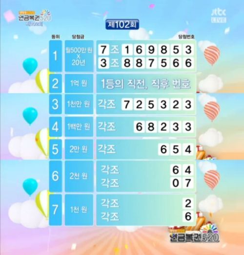일시불로 지급되는 2등은 1등의 앞, 뒤 번호로 3조 887565번, 3조 887567번, 7조 169852번, 7조 169854번과 3등 각조 725323번, 4등 각조 68233번, 5등 각조 654번, 6등 각조 64번, 각조 07번, 7등 각조 2번, 각조 6번이 선정됐다.
