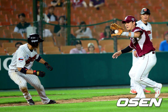 12일 오후 부산 사직구장에서 열린 '2013 한국야쿠르트 세븐 프로야구' 롯데 자이언츠와 넥센 히어로즈의 경기, 6회말 1사 3루 롯데 박종윤이 김대우의 1루 앞 땅볼 타구때 런다운에 걸려 넥센 김민성에게 아웃당하고 있다.