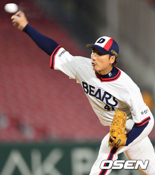 12일 오후 서울 잠실야구장에서 '2013 한국야쿠르트 세븐 프로야구' 두산 베어스와 SK 와이번스의 경기가 열렸다. 8회초 SK 공격 구원등판한 두산 투수 정재훈이 힘차게 공을 뿌리고 있다.