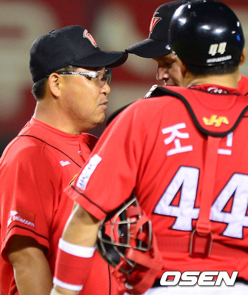 12일 오후 서울 잠실야구장에서 '2013 한국야쿠르트 세븐 프로야구' 두산 베어스와 SK 와이번스의 경기가 열렸다. 8회말 두산 공격 2사 2루 상황 SK 이만수 감독이 마운드에 올라 선발 레이예스와 대화를 나누고 있다.