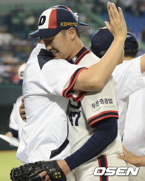 9회 마운드에 올라 삼자범퇴로 경기를 매조지한 두산 투수 홍상삼이 정명원 코치와 포옹하며 기쁨을 나누고 있다./dreamer@osen.co.kr