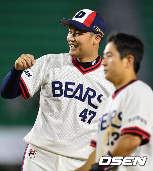 9회 마운드에 올라 삼자범퇴로 경기를 매조지한 두산 투수 홍상삼이 경기 종료 직후 환하게 미소지으며 동료들과 인사를 나누고 있다./dreamer@osen.co.kr