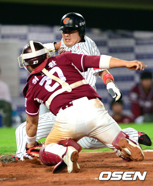 12일 오후 부산 사직구장에서 열린 '2013 한국야쿠르트 세븐 프로야구' 롯데 자이언츠와 넥센 히어로즈의 경기, 8회말 2사 1,2루 2루주자 롯데 문규현이 황재균의 안타로 홈까지 쇄도하다 홈에서 넥센 허도환에게 태그아웃 당하고 있다.