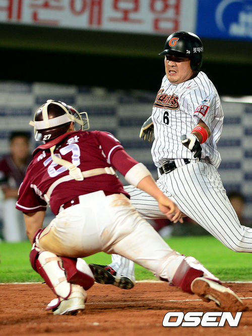 12일 오후 부산 사직구장에서 열린 '2013 한국야쿠르트 세븐 프로야구' 롯데 자이언츠와 넥센 히어로즈의 경기, 8회말 2사 1,2루 2루주자 롯데 문규현이 황재균의 안타로 홈까지 쇄도하다 홈에서 넥센 허도환에게 태그아웃 당하고 있다.