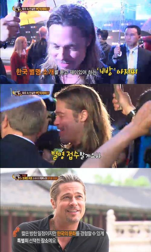브래드 피트는 12일 오후 방송된 SBS '한밤의 TV연예'에서 한국에서 '빵아저씨'라 불리는 것에 대해 설명을 듣고 "접수하겠다"며 재미있어하는 반응을 보였다.