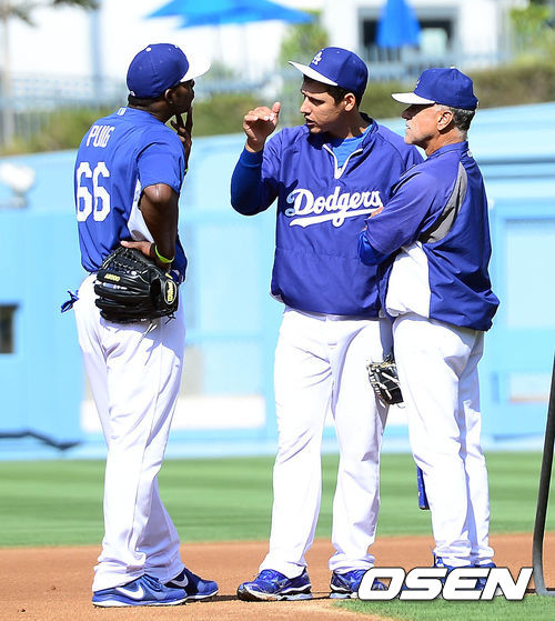 13일 오전(이하 한국시간) 미국 캘리포니아주 로스앤젤레스 다저스타디움에서 열린 LA 다저스와 애리조나 다이아몬드백스의 경기 시작 전 푸이그, 크루스, 로페스 코치가 이야기를 나누고 있다.