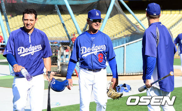 13일 오전(이하 한국시간) 미국 캘리포니아주 로스앤젤레스 다저스타디움에서 열리는 LA 다저스와 애리조나 다이아몬드백스의 경기 시작 전 매팅리 감독이 선수들의 훈련을 돕고 덕아웃으로 향하고 있다.