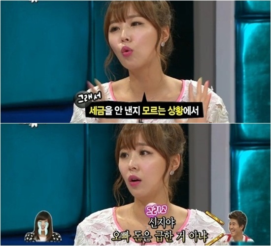 신지는 지난 12일 방송된 MBC 예능프로그램 '황금어장-라디오스타'에서 김종민의 돈을 빌린 이유에 대해 "작년 솔로활동 때 갑자기 세금 폭탄을 맞았기 때문"이라고 답했다.