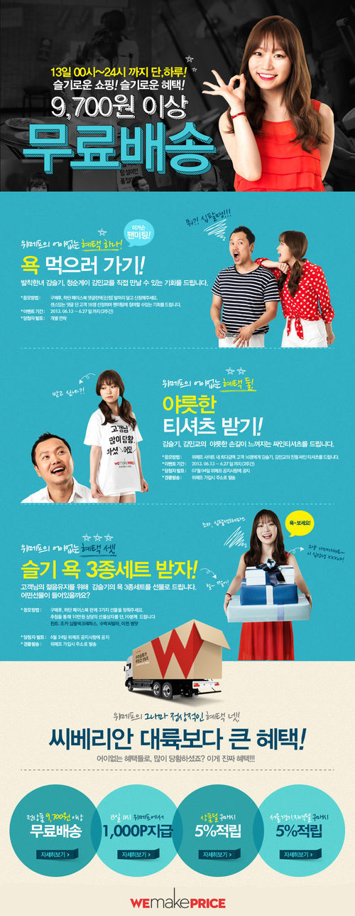 위메프는 6월 한달간 김슬기의 슬기로운 쇼핑 캠페인을 전개하며 국내최초 소셜최저가 보상제와 2013년 1월부터 6개월째 연속 진행중인 배송상품 무조건 5%적립 프로모션을 함께 진행한다.