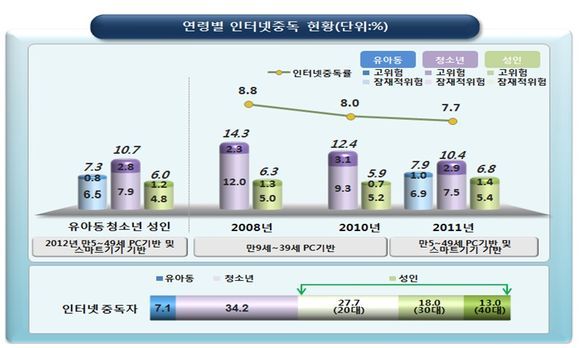 미래창조과학부, 교육부, 문화체육관광부, 보건복지부, 여성가족부, 방송통신위원회 등 8개 정부 부처는 ‘2012년 인터넷중독 실태조사’ 결과를 토대로 인터넷과 스마트미디어 중독 해소를 위해 유아부터 성인까지 생애주기별, 예방부터 사후관리까지 단계별 통합지원을 강화해 나가기로 했다.