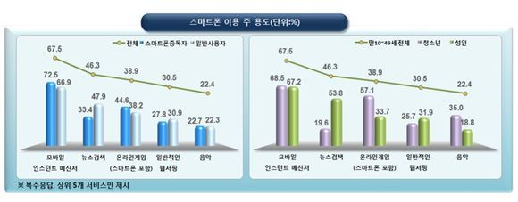 전체적으로 스마트폰 이용자는 1일 평균 4시간(1일 평균 22회×11분/1회) 사용하였으나, 스마트폰 중독자는 7.3시간을 사용(1일 평균 23회×19분/1회)해 크게 차이가 났다. 전체적으로 스마트폰 이용의 주 목적은 모바일 메신저 사용(67.5%)으로 나타났고, 그 다음으로 스마트폰 중독자는 온라인게임을 주 목적(44.6%)으로 이용하는 반면, 일반사용자는 뉴스검색(47.9%) 비율이 높았다.