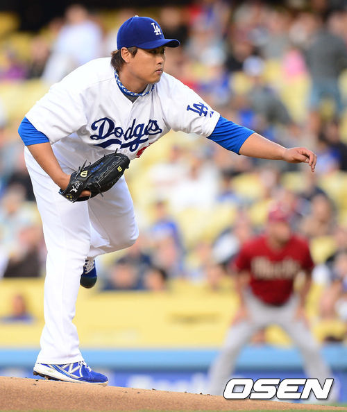 13일 오전(이하 한국시간) 미국 캘리포니아주 로스앤젤레스 다저스타디움에서 LA 다저스와 애리조나 다이아몬드백스의 경기가 열렸다. 1회초 애리조나 공격 다저스 선발 류현진이 힘차게 공을 뿌리고 있다.