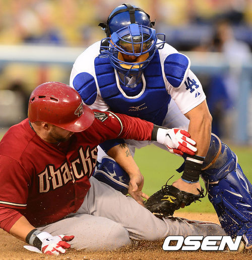 13일 오전(이하 한국시간) 미국 캘리포니아주 로스앤젤레스 다저스타디움에서 LA 다저스와 애리조나 다이아몬드백스의 경기가 열렸다. 4회초 애리조나 공격 무사 1, 2루 상황 6번 프라도의 좌전 안타 상황, 2루 주자 로스의 홈쇄도 때 다저스 포수 에르난데스가 송구를 놓치며 득점을 허용하고 있다.