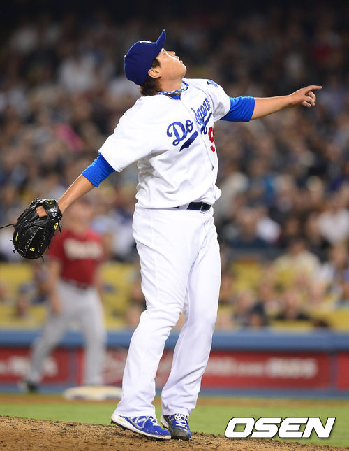 13일 오전(이하 한국시간) 미국 캘리포니아주 로스앤젤레스 다저스타디움에서 LA 다저스와 애리조나 다이아몬드백스의 경기가 열렸다. 6회초 애리조나 공격 2사 만루 상황 대타 블룸퀴스트를 내야 뜬공으로 잡아내며 실점없이 이닝을 마무리지은 다저스 선발 류현진이 손을 높이 치켜들고 있다.