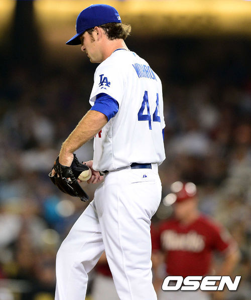 13일 오전(이하 한국시간) 미국 캘리포니아주 로스앤젤레스 다저스타디움에서 LA 다저스와 애리조나 다이아몬드백스의 경기가 열렸다. 7회초 류현진에 이어 마운드에 오른 위드로가 애리조나 몬테로에 동점 좌전 적시타를 허용하며 아쉬워하고 있다.