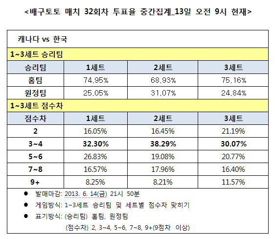 국내 배구팬들은 2013 월드리그 캐나다-한국전을 대상으로 한 배구토토 매치 32회차 게임에서 한국의 고전을 점쳤다.