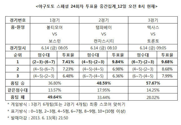 MLB 3경기 대상 야구토토 스페셜 24회차 투표율 중간집계