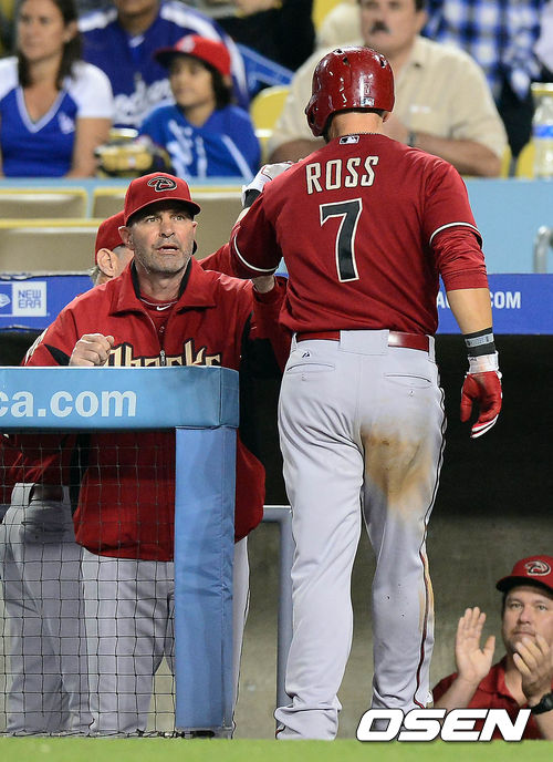 13일 오전(이하 한국시간) 미국 캘리포니아주 로스앤젤레스 다저스타디움에서 LA 다저스와 애리조나 다이아몬드백스의 경기가 열렸다. 12회초 무사 1,3루 프라도의 1타점 2루타에 홈을 밟은 로스가 깁슨 감독과 하이파이브를 하고 있다.