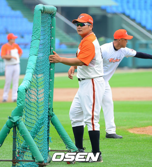 13일 오후 대전구장에서 열리는 '2013 한국야쿠르트 세븐 프로야구' 한화 이글스와 LG 트윈스의 경기, 경기에 앞서 한화 김태균이 이동 펜스를 끌며 훈련 준비를 하고 있다