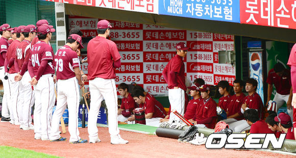 12일 부산 사직구장에서 열리는 '2013 한국야쿠르트 세븐 프로야구' 롯데 자이언츠와 넥센 히어로즈의 경기전 넥센 염경엽 감독이 선수들과 이야기를 나누고 있다.